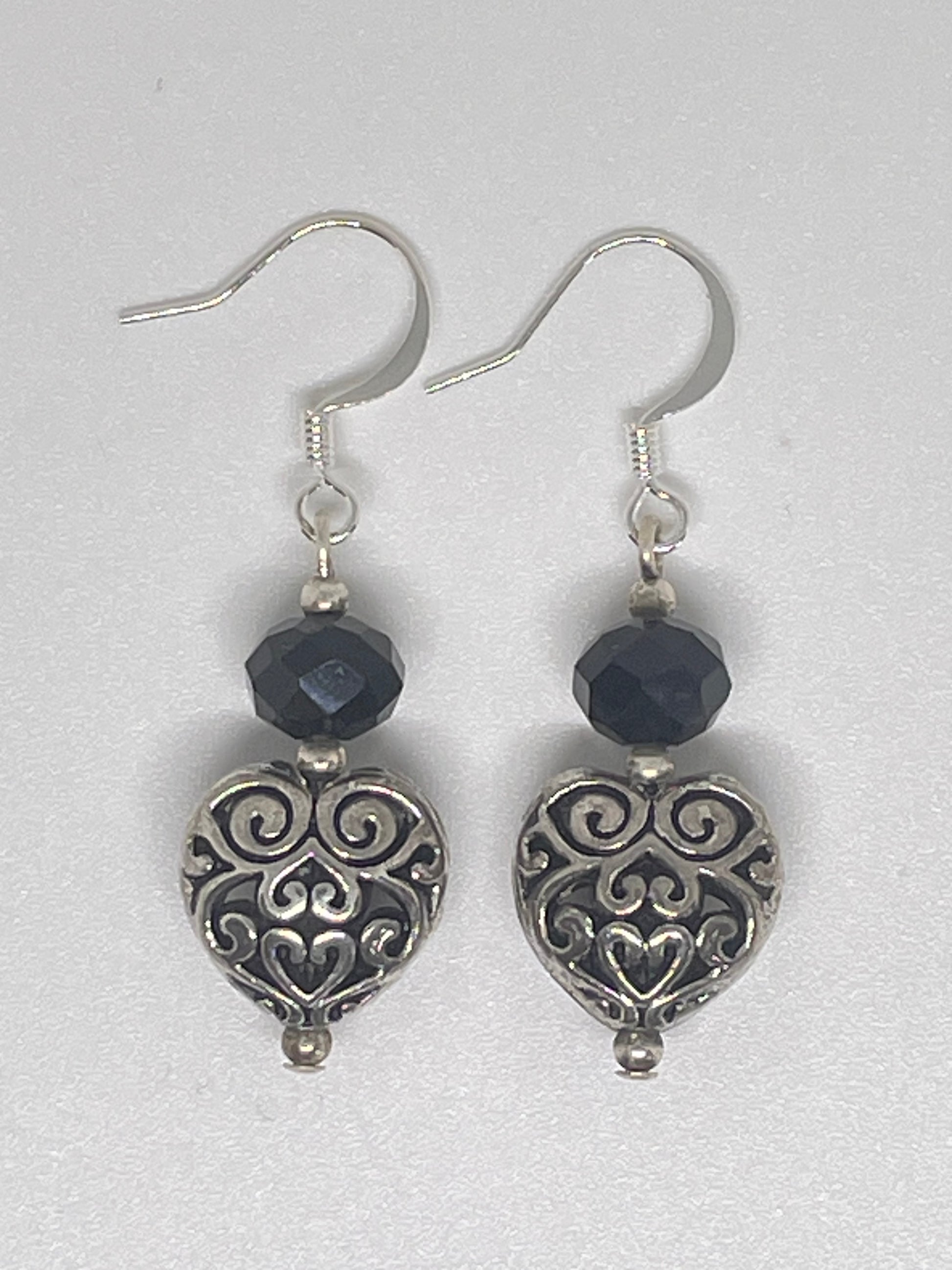 Handmade earrings using a black crystal bead and alloy filigree heart with silver coloured metal filler beads and low allergenic shepherd hooks.
